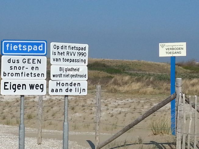Vertrek uit Leiden om 14.00 uur. Dat begint al goed. Na een halfuur vraagt Willemijn of we er al bijna zijn. Na een uur zwabbert haar voorwiel al zodanig dat we een nieuwe (tweedehands) fiets moeten kopen. Daarna gaat alles van een leien dakje. De zon schijnt, we hebben wind mee, we kiezen consequent de 'groene' routes door de duinen en om 19 uur zijn we in Hoek van Holland en gaan we aan boord.